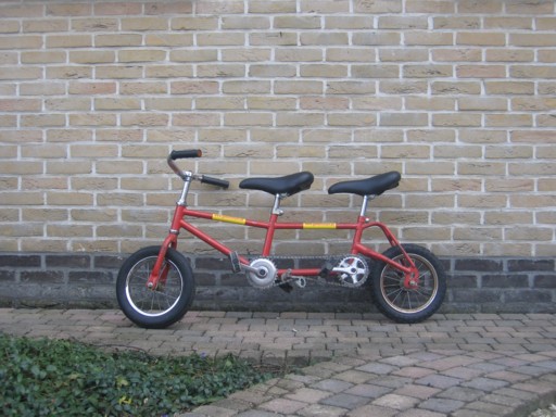 De mini tandem rijdt zoals een gewone tandem, maar is veel kleiner. Voor kinderen en/of volwassen
